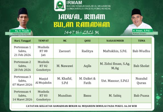 KENDAL – Ikatan Remaja Masjid Al Mujahidin (IRMAM) Desa Gondoharum, Kecamatan Pageruyung, Kabupaten Kendal, resmi merilis jadwal kegiatan rutin selama bulan suci Ramadan 1447 H / 2026 M. Kegiatan ini bertujuan untuk membekali para remaja dengan ilmu agama sekaligus mempererat silaturahmi antarwarga di berbagai wilayah desa.